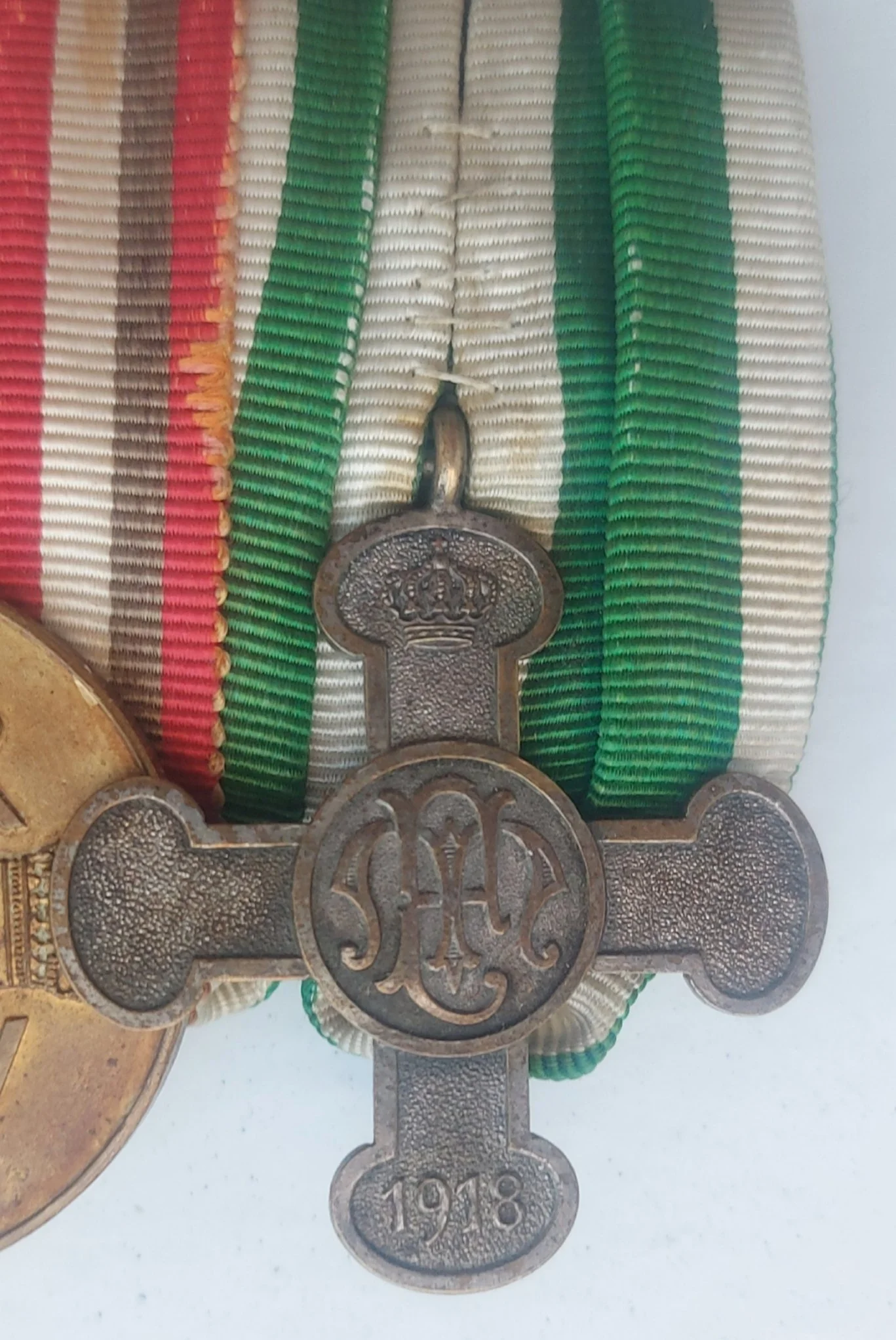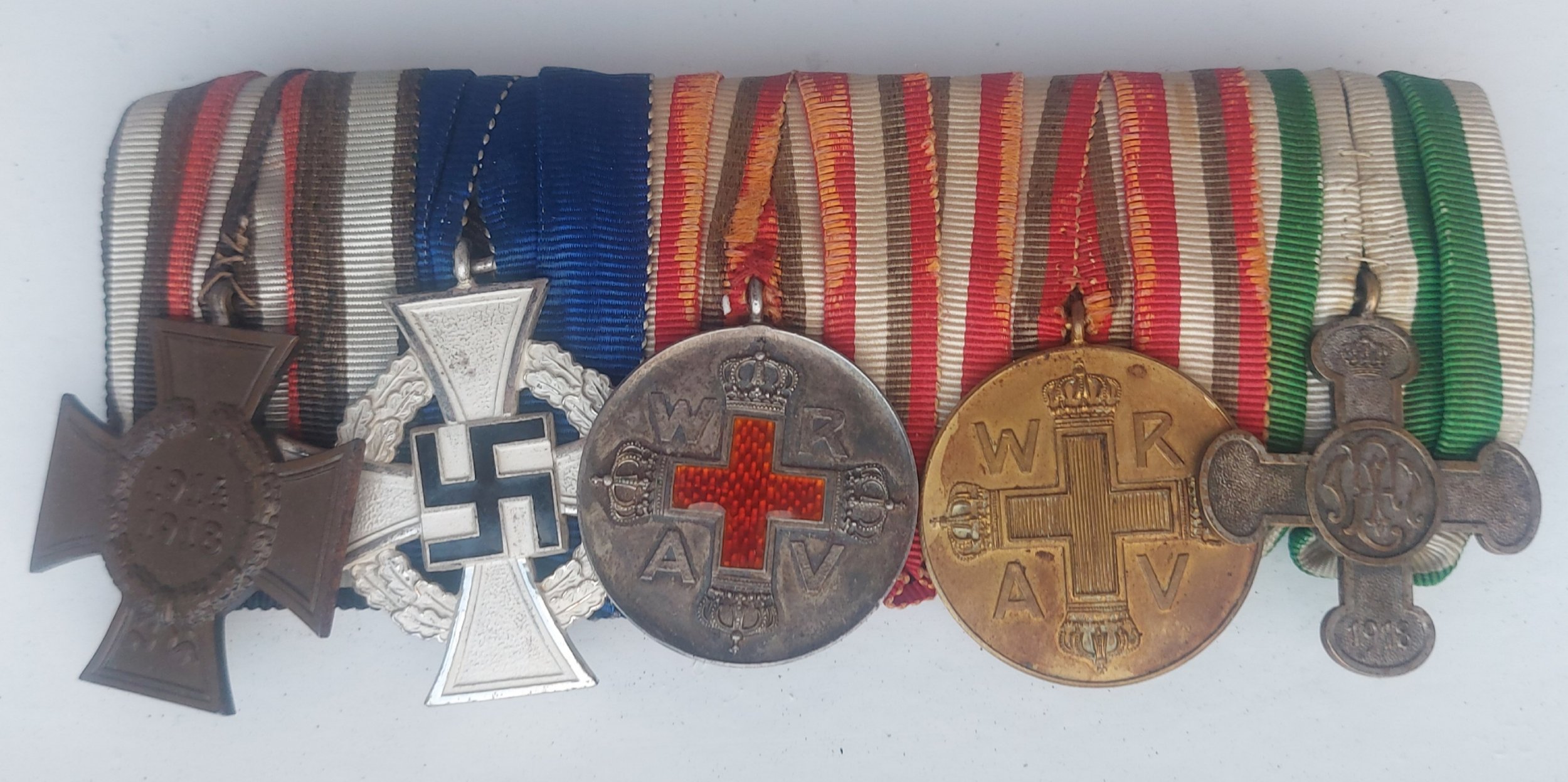 Abb. 4: Große Ordensschnalle mit Kriegsteilnehmerkreuz, Treudienstehrenzeichen für 25 Dienstjahre, Preuß. Rothe-Kreuz-Medaille 2. und 3. Klasse, Anhalt Marienkreuz, allerdings am inkorrekten Band