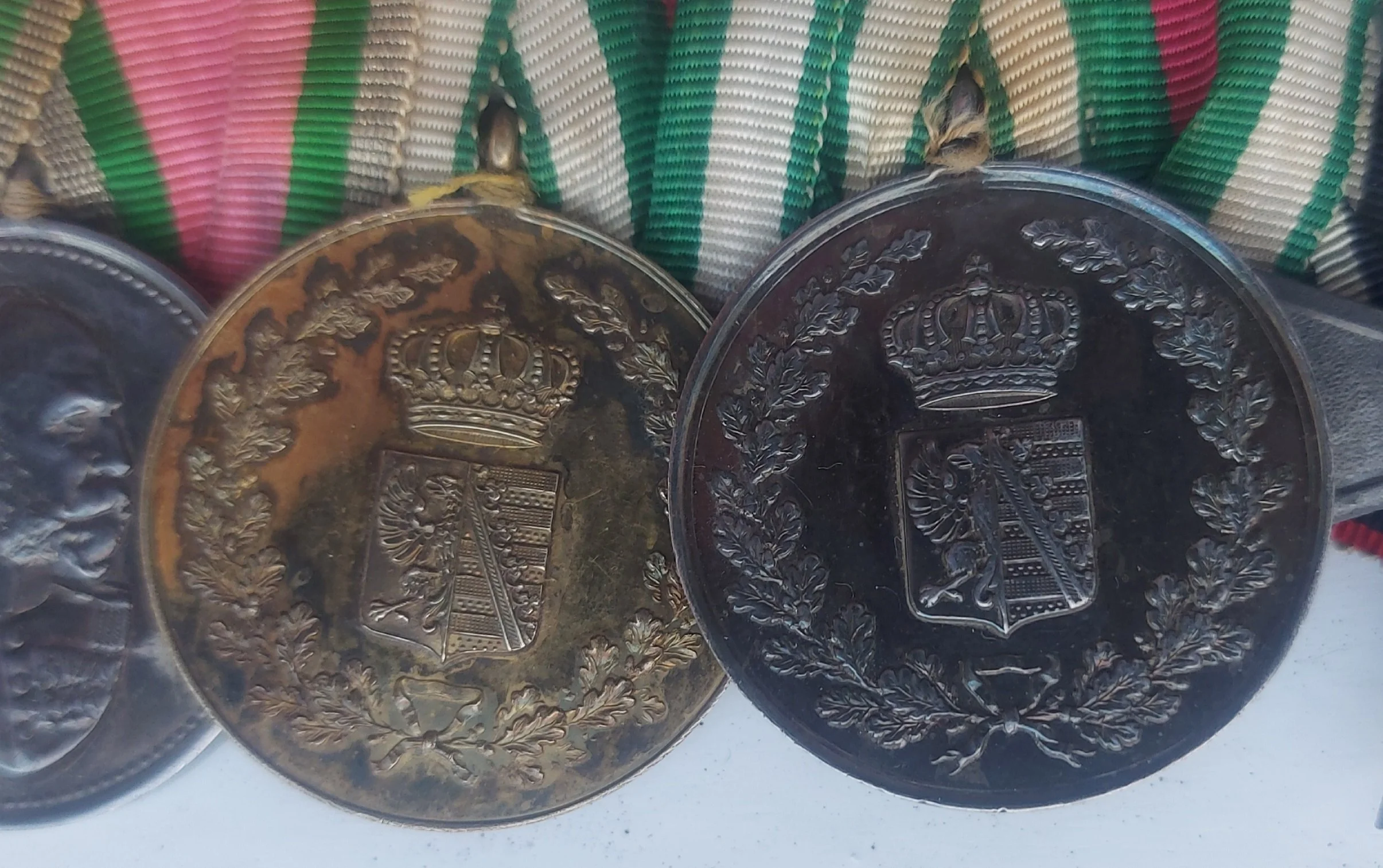 Der lange Verleihungszeitraum von 1888 bis zum Ende der Monarchie und die doch recht hohe Verleihungszahl machte offenbar die Anfertigung mindestens eines zweiten Stempels für dieses Ehrenzeichen nötig. Im Detailbild ist deutlich zu erkennen, dass das silberne Ehrenzeichen aus der Erst- Verleihungsserie 1888 sehr detailliert und konturstark vom noch nicht abgenutzten – offenbar - ersten Stempel stammt, das goldene Ehrenzeichen bereits aus einem leicht varianten, wohl späteren Stempel. Bei diesem ist deutlich die durch Abnutzung bedingte flachere Struktur des Blattkranzes sichtbar. Eine genauere Betrachtung der Rückseite verbietet uns leider die feste Vernähung an der Schnalle.